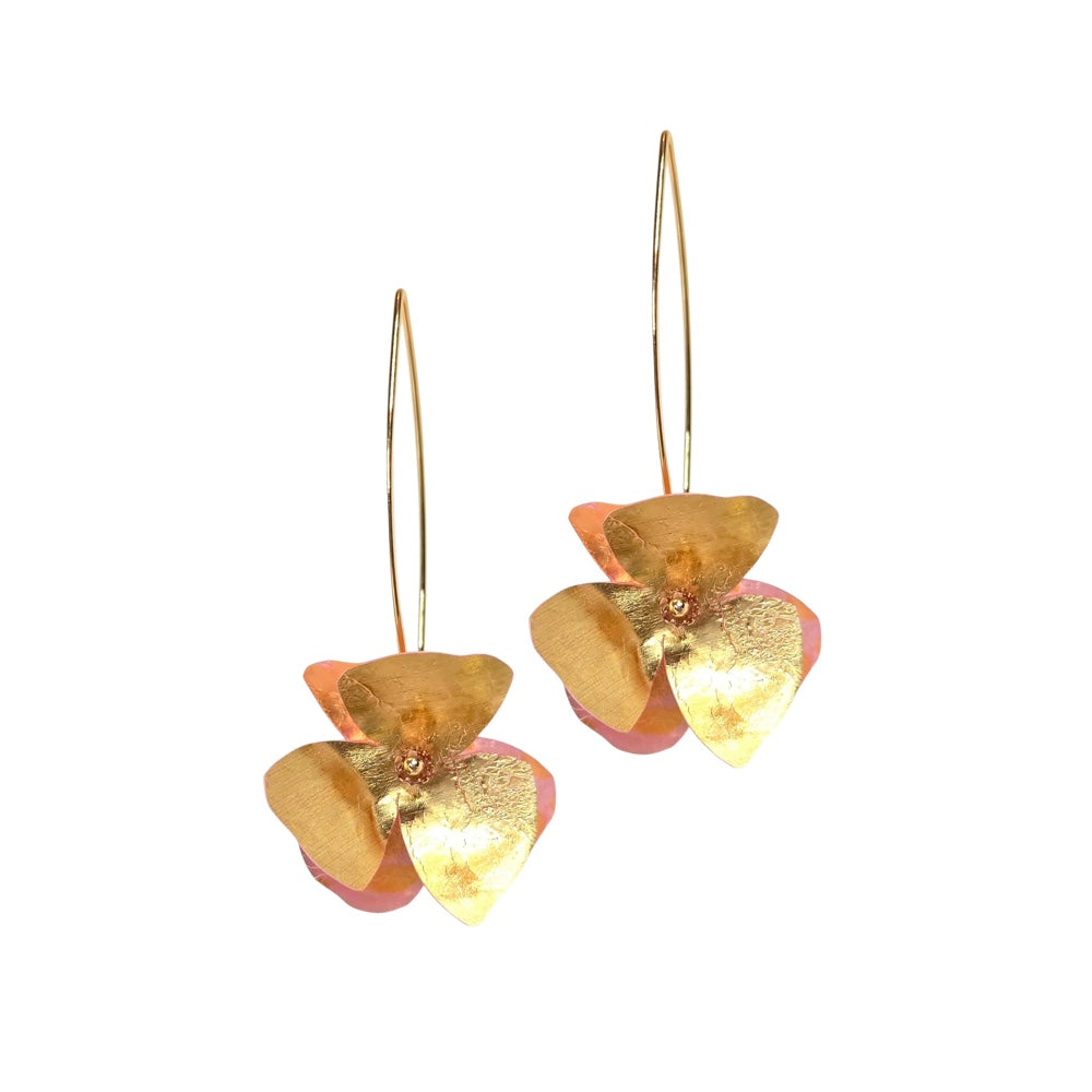 Recycled bendy moulded plastic petals, with Crystals. Gold plated ear hooks.